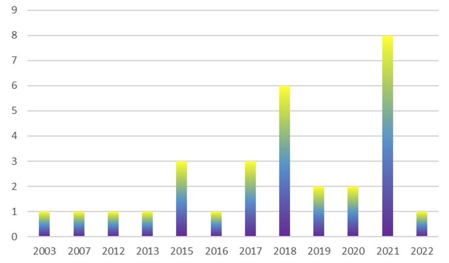 Tabla 2. Cantidad de textos analizados de acuerdo con el año de publicación.