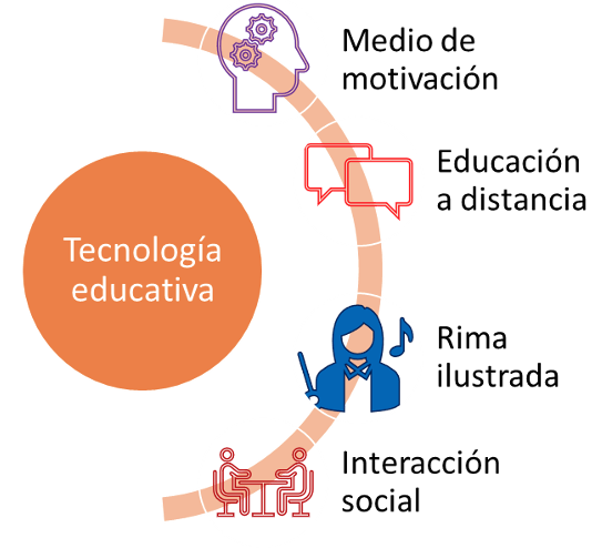 La segunda categoría que surge del análisis documental es la «Tecnología educativa». Ésta alude al uso de herramientas didácticas mediadas por la tecnología. Además, los tópicos hallados en todo el material recolectado corresponden al medio de motivación, la educación a distancia, la rima ilustrada y la interacción social.