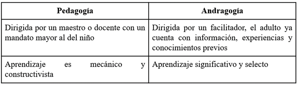 Finalmente, algunas de las diferencias entre pedagogía y andragogía son: la pedagogía es dirigida por un maestro o docente, una persona que se caracteriza por un mandato mayor al del niño, mientras en la andragogía se dirige por un facilitador, en donde el adulto ya cuenta con información, experiencias y conocimientos previos, a comparación del niño que está abierto a posibilidades nuevas por experimentar, sin embargo, esta información previa puede llegar a ser un obstáculo en cuanto a que el cerebro del adulto lo limita ante conocimientos nuevos, en cambio el del niño es la búsqueda de información nueva.