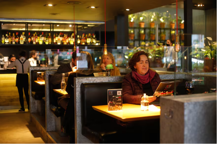 En esta escena se observa un plano general del interior de un bar. El primer plano, ubicado en el tercer tercio, destaca una mujer sentada revisando la carta de menús, con una botella de alcohol en gel en el centro de la mesa. Desde este punto, una línea vertical guía la mirada a lo largo de una hilera de mesas con comensales, separadas por vidrios transparentes o barreras sanitarias anti-COVID 19, que finalizan en una barra de bar con figuras humanas difuminadas, vestidas con el uniforme de trabajo del lugar y con barbijos.
