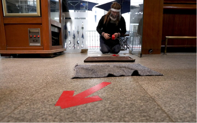 En esta imagen, aplicando la regla de tres tercios, el horizonte se encuentra en el tercio superior. En el centro de la composición, una mujer arrodillada en el umbral de una puerta de vidrio, con barbijo y máscara protectora, vistiendo un suéter y un jean. Se la observa colocando cintas rojas en el piso, formando flechas que indican la ubicación de una alfombra sanitizadora y la dirección que deben seguir quienes ingresan al bar. A los lados, una máquina y un mostrador enmarcan la escena. El fotógrafo guía la mirada al suelo de granito, resaltándolo como elemento destacado.