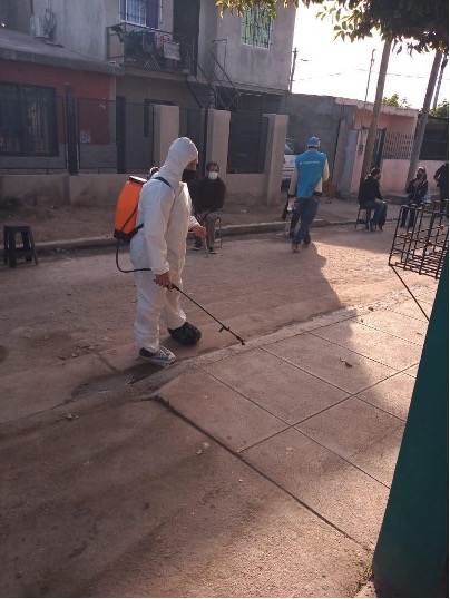 En esta escena, la referente comunitaria captura un fragmento de la vida cotidiana en los barrios. En el centro de la imagen, una persona vestida con un mameluco blanco completo, capucha y barbijo sostiene un pulverizador y lo dirige hacia el cordón de una vereda en una calle angosta de tierra. Al fondo, se observa a una persona adulta sentada con barbijo, mientras que detrás de ella otras dos personas, también con barbijos, permanecen en sillas a una distancia de 1,20 metros. A su vez, una persona de espaldas camina por la calle con una pechera de la Municipalidad de Córdoba.