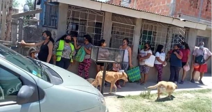 La fotografía corresponde a un plano general. En la imagen, una fila de diez personas, nueve de ellas mujeres, se extiende de izquierda a derecha a lo largo de toda la composición. Todas llevan barbijo y sostienen bolsas o tapers mientras esperan apoyadas en la fachada de una casa sin pintar, con rejas blancas y techo de chapa. A su lado, se observa otra construcción sin revoque. En la vereda en el barrio Comunidad Renó, dos perros caminan, completando la escena.