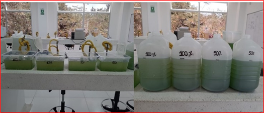 El agua residual porcícola se sometió a un cultivo mixto de microalgas, que se extrajo de la quebrada La Cajita, ubicada en el municipio de Melgar, Tolima. Para el tratamiento se implementaron dos tipos de sistemas (tipo pecera y tipo botella) (Figura 1). Se evaluaron tres concentraciones de agua residual, cada reactor tuvo un inoculo de microalgas de 1x106 células/ml. En los dos sistemas se controlaron los parámetros de temperatura, pH, luminosidad y aireación constante. La réplica de cada tratamiento tuvo un fotoperiodo de luz y de aireación durante las 24 horas. Se determino la concentración inicial y final de nitratos y fosfatos con el fin de establecer la eficiencia de los reactores.