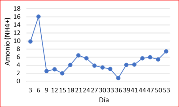 De acuerdo con los datos obtenidos, se observó una fluctuación en la concentración de amonio (mg/L) durante el periodo experimental de 18 días, con valores que oscilaron entre un mínimo de 0,8 mg/L y un máximo de 16,1 mg/L. Se registró una concentración inicial de 9,9 mg/L, que aumentó a 16,1 mg/L. Este aumento puede atribuirse a la acumulación de alimento no consumido por los peces y al incremento de compuestos nitrogenados, producto de la actividad metabólica de los peces, antes de que el biofiltro lograra estabilizarse. Además, parte de la descomposición del alimento no ingerido ocurre en el fondo del tanque, por la acción de las bacterias nitrificantes. Sin embargo, al no tener un sustrato para su adhesión, estas pueden tardar entre cuatro a ocho semanas en colonizar el fondo y descomponer eficazmente el amonio en esta unidad operativa. También es necesario destacar que el sistema radicular de las plantas de Capsicum annuum en el prototipo aún no era lo suficientemente extenso como para estar completamente sumergido en el agua de recirculación.