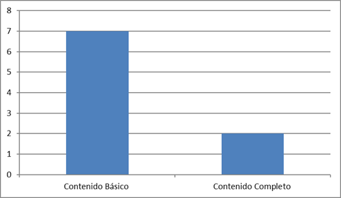 En la anterior figura se muestran los resultados del estudio realizado en las 11 facultades de ingeniería que ofertan programas en la ciudad de Barranquilla de manera presencial. En dos de ellas álgebra lineal no forma parte del plan de estudios o está integrada a otra asignatura. Para el análisis de los contenidos se diseñaron dos categorías: la primera, llamada contenido básico (vectores, matrices, sistemas de ecuaciones), y la segunda, contenido completo (básico más espacios vectoriales, transformaciones lineales, autovalores, auto vectores diagonalización, triangularización, formas de Jordan). Se evidencia que el 78 % de los contenidos de álgebra lineal están en la categoría “contenido básico”, correspondiente a siete de las nueve facultades en las que forma parte del plan de estudios, es decir, el 22 % se ubican en “contenido completo”, equivalente a dos facultades.