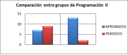 La Figura 5 muestra cómo mejoró el rendimiento de los estudiantes en dos semestres. En el primero se nota que 9 de los 16 estudiantes no aprobaron la asignatura programación II. En el segundo, 13 de 15 superaron dicha asignatura.