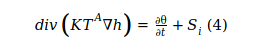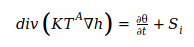 Dónde: K es la conductividad hidráulica; h es el potencial del agua en el suelo; t es el tiempo; θ es la humedad presente en el suelo; TA es un tensor adimensional de segundo orden que representa la naturaleza anisótropa del medio, y S_i es una fuente exterior
