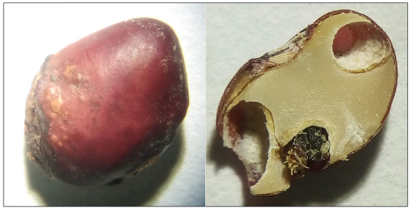 Las semillas presentan una incidencia media de patógenos del 1,23 %, por la presencia de gorgojo inactivo en la muestra, de la especie Acanthoscelides obtectus y de la familia Curculionidae. Este resultado se obtuvo evaluando las semillas con baja condición de desarrollo y con malformaciones (figura 2).