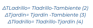 Indiscutiblemente, el diferencial entre el ladrillo y el ambiente, en promedio, es de 5,2 °C; del jardín y el ambiente es de 1,5 °C, y del jardín y el ladrillo es de 3,65 °C.