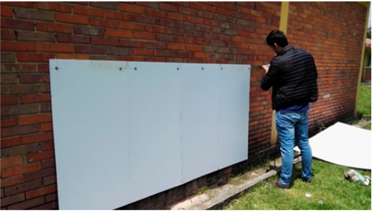 Este proyecto tiene un enfoque experimental, debido a la técnica que se emplea (termograf ía), que permite determinar temperaturas a distancia y sin necesidad de contacto físico con el objeto que se va a estudiar. La construcción del jardín vertical se realizó en el interior de la Universidad Libre, sede Bosque, en el bloque B. El área que se utilizó para la construcción del jardín vertical fue de 2,3 m × 1,8 m. Para iniciar el montaje del jardín se necesitó: