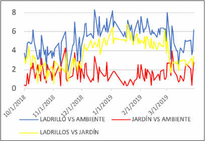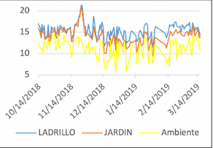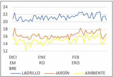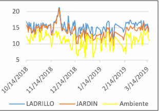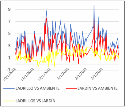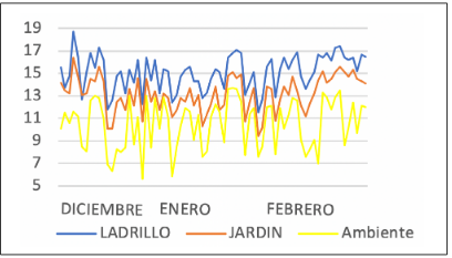 Finalmente, se pueden observar diferenciales en promedio de hasta 5 °C entre el ladrillo y el jardín; de 6,3 °C entre el ladrillo y el ambiente, como se observa en la