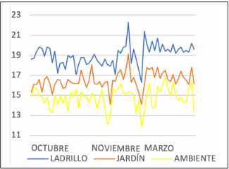 Se debe agregar que el diferencial de temperatura máximo entre el ladrillo y el ambiente fue de 8,3 °C, y el mínimo, de 1,5 °C en diciembre y octubre, respectivamente. Por otro lado, el máximo y mínimo gradiente de temperatura entre el jardín y el ambiente fue de 4,3 °C en noviembre y de 0,3 °C en octubre, noviembre y enero.