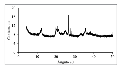 En la caracterización por DRX de la arcilla Cochancay empleada como materia prima para la preparación de los sorbentes (figura 1) se observa que el diagrama de difracción de la arcilla corresponde a un material prácticamente amorfo, en el cual se pudo identificar un máximo de difracción a 12,4 °2 típico de caolinita [18], y los máximos de difracción a 20,8 °2 y 26,7 °2 atribuidas a -cuarzo [19]. Como las intensidades de estos máximos de DRX son proporcionales a la cantidad de mineral presente en la muestra [20], se puede decir que la proporción de estas fases en la arcilla es baja. La baja intensidad de las líneas DRX indica que la arcilla se podría clasificar dentro del grupo de Alofano [21].