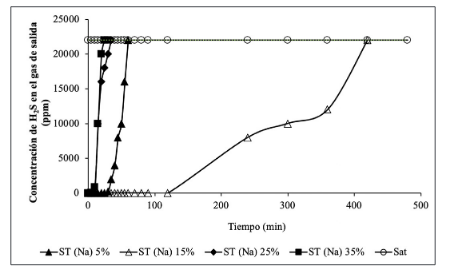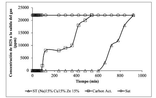 La cantidad de H2S removida de los extrudados 15 %Na15 %Cu15 %Zn alcanzó un valor de 2,84 mmol de H2S por gramo de sorbente; mientras que el carbón activado industrial alcanzó el valor de 2,58 mmol de H2S por gramo de sorbente. Se puede observar que el sólido modificado con NaOH, cobre y zinc tiene una capacidad de remoción del H2S mayor en un 10 % (figura 8). La diferencia en el tiempo en que la concentración de H2S se mantiene nula y el tiempo de saturación es más notable entre estos dos sólidos, por lo que la velocidad de cambio de sorbente sería menor en el sorbente desarrollado