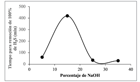 El sorbente que se saturó más lento fue la muestra ST15 %Na, la cual, hasta los 120 min de exposición, alcanzó una remoción del 100 % de H2S, y fue disminuyendo su capacidad, removiendo a los 330 min el 50 % y alcanzando la saturación a los 420 min. En la figura 3 se muestra la variación del tiempo que dura la remoción del 100 % de la concentración inicial de H2S presente en el biogás, en función del contenido de NaOH añadido a la arcilla. En esta figura se observa claramente que la concentración de NaOH que permitió remover el 100 % del H2S, durante un mayor tiempo, fue el 15 %. Para el estudio del efecto de la adición de cobre y zinc se utilizó esa concentración de NaOH