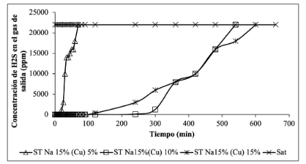 Los resultados de la figura 6 indican que la combinación NaOH-15 %Cu-15 %Zn, en el extrudado, funciona mejor en comparación con los extrudados con un 15 % de NaOH o las combinaciones 15 %NaOH-15 %Cu y 15 %NaOH-15 %Zn. Hay una mejora notable en el tiempo que dura la remoción del 100 % de H2S, pues llega hasta los 600 min, y en el tiempo de saturación que llega hasta los 920 min; mientras que con solo NaOH, o con solo un metal se llega hasta un máximo de 120 min manteniendo la concentración de H2S en cero y 660 min para tiempo de saturación.