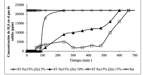 La combinación de cobre y zinc sobre adsorbentes de Al2O3 ha sido utilizada para la desulfuración reactiva de corrientes gaseosas, luego de encontrarse que se incrementa la capacidad de remoción del H2S con la combinación de los óxidos de los metales [27]. Se comparó la capacidad de remoción en función del tiempo de uso de extrudados modificados con un 15 % de NaOH, un 15 % de cobre con la concentración de zinc del 5 %, 10 % y 15 % (figura 6). Se puede observar que el sorbente que presentó una mayor capacidad de remoción de H2S de la corriente de biogás durante un mayor tiempo fue el que contenía un 15 % de zinc, ya que la concentración de H2S a la salida del filtro fue indetectable durante los primeros 600 min, en comparación con la del sólido con un 10 % de zinc, el cual presentó la concentración de 0 % de H2S hasta 240 min y la muestra con un 5 % de zinc mantuvo la concentración de H2S nula por 80 min. El tiempo de agotamiento en el cual los extrudados con diferentes concentraciones de zinc alcanzan los 10.000 ppm sigue la misma tendencia arriba indicada: 420 min para la muestra con un 5 % de zinc, 600 min para la muestra con un 10 % de zinc y 720 min para la muestra con un 15 % de zinc. Las muestras se saturan permitiendo que la concentración de H2S a la salida del filtro sea de 22.000 ppm a los 540 min para la muestra con un 5 % de zinc, 840 min para la muestra con un 10 % de zinc y 920 min para la muestra con un 15 % de zinc