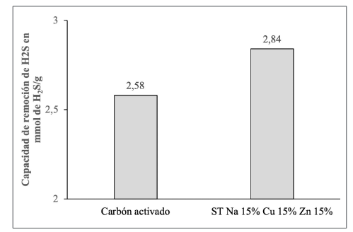 Efecto de la concentración de cobre y cinc sobre la remoción de H2S. Se preparó un sorbente con las proporciones que presentaron mejores resultados de NaOH, cobre y zinc y se evaluó su capacidad de remoción de H2S.