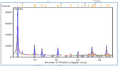 〖Si〗_96 〖Al〗_96 O_(384.00 ) 〖Na〗_93,44,con código de referencia 96-900-5388 con un sistema cristalino cúbico, grupo espacial Fd-3 y número de grupo espacial 203. Entre tanto, la fórmula química luego del intercambio iónico con plata mostró 〖Ag〗_74,24 H_17,3 〖Si〗_100,5 〖Al〗_91,5 O_384 〖〖(H〗_2 O)〗_78,72; con código de referencia 96-153-9919 y presenta las mismas características cristalinas de la zeolita inicial. Se denota que existió el intercambio del Na por la Ag. Cabe destacar que existen otras pruebas, como fluorescencia de rayos X, espectroscopia, resonancia magnética nuclear, entre otras, que ayudan a definir exactamente la estructura de la zeolita. En este estudio solamente se empleó la difracción de rayos X. El difractograma se presenta en la