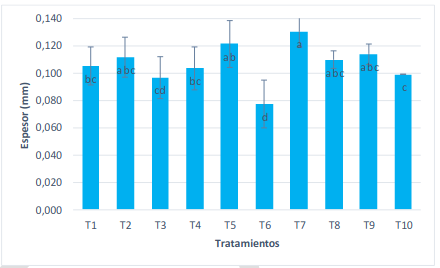 Las películas presentaron valores de 0,77 mm, 0,099 mm y 0,130 mm, correspondientes a los tratamientos T6, T10 y T7, respectivamente, cuyas películas contienen almidón de zanahoria blanca con zeolita faujasita tipo X al 0,00 %, al 0,50 % y al 0,05 % de plata, respectivamente, es decir son significativamente diferentes las medias que no compartan una letra (p < 0,05), así como se observa en la