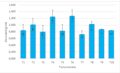 La densidad de las películas se obtuvo en un rango de 1,25-1,27 g/ml, correspondiente al tratamiento T4 y T6, respectivamente, las cuales son de almidón de yuca (con 0,25 % de zeolita con plata) y almidón de zanahoria blanca (con 0,00 % de zeolita con plata). Son significativamente diferentes las medias que no compartan una letra (p < 0,05). Así, se observa en la