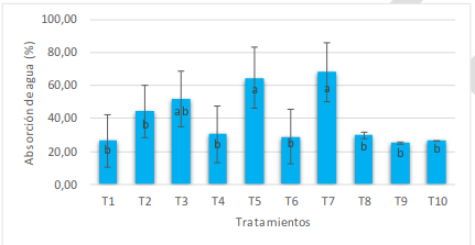 La absorción del agua resultante de las películas biodegradables está en el rango del 25,12 % y del 68,06 %, correspondientes a los tratamientos T9 (almidón de zanahoria blanca con un 0,25 % de plata impregnada en zeolita faujasita tipo X) y T7 (almidón de zanahoria blanca con un 0,05 % de plata impregnada en zeolita faujasita tipo X), respectivamente, es decir, son significativamente diferentes las medias que no compartan una letra (p < 0,05). Así se observa en la