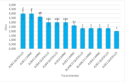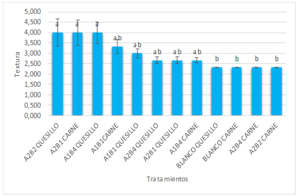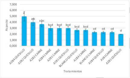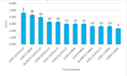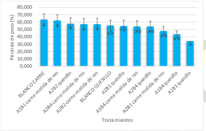 Los porcentajes de pérdida de peso obtenidos fueron elevados y solo el tratamiento A1B1 quesillo, correspondiente a almidón de yuca con zeolita faujasita tipo X con un 0,00 % de plata alcanzaron un valor del 34,21 %, y así actúan como barrera a la pérdida de peso. La que tuvo un mayor porcentaje de pérdida de peso, del 63,32 %, corresponde al blanco carne molida de res. Estos tratamientos son significativamente diferentes, ya que las medias no comparten una letra (p < 0,05) (