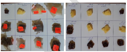 Los tratamientos que influyeron directamente en las características organolépticas del quesillo fresco y de la carne de res molida envueltas en las películas y con valores de mayor puntuación y menor desviación estándar son: para el color A2B2 quesillo (almidón de zanahoria blanca con un 0,05 % de plata impregnada en zeolita faujasita tipo X) y A2B4 carne (almidón de zanahoria blanca con un 0,25 % de plata impregnada en zeolita faujasita tipo X); para el olor A2B1 carne (almidón de zanahoria blanca con un 0,00 % de plata impregnada en zeolita faujasita tipo X) y A2B2 quesillo (almidón de zanahoria blanca con un 0,05 % de plata impregnada en zeolita faujasita tipo X); para la textura, A1B4 quesillo (almidón de yuca con un 0,25 % de plata impregnada en zeolita faujasita tipo X), A2B1 carne (almidón de zanahoria blanca con un 0,00 % de plata impregnada en zeolita faujasita tipo X) y A2B2 quesillo (almidón de zanahoria blanca con un 0,05 % de plata impregnada en zeolita faujasita tipo X), y para el aspecto A2B4 quesillo (almidón de zanahoria blanca con un 0,25 % de plata impregnada en zeolita faujasita tipo X). Las evidencias de lo descrito se muestran en las figuras 9 a 13