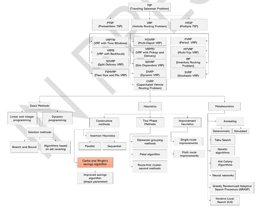 Moreover, the optimization allows a much more dynamic and reliable control in the decision-making process [7]. The problem of vehicle routing (Vehicle Routing Problem - VRP) determines the optimal set of routes that a fleet of vehicles must take to service a specific set of customers [8]. The evolution of the VRP since its origin with the TSP, as one of the most common problems in terms of logistics optimization, presents a series of branches such as Exact, Heuristic and Metaheuristic Methods, which can be seen in Figure 2: