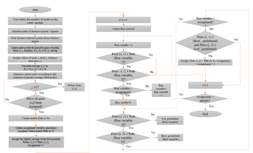Figure 3 below details the use of this tool for the application of the savings algorithm by means of a decision flow diagram where the sequence of steps to be followed, for the definition of the routes in the Trans2000 company, is specifically demonstrated.
