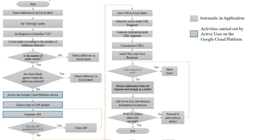 Besides, regarding the use of the application, the following ideas are concluded: a) The savings algorithm was developed in the Visual Basic programming environment for Excel Applications, since it is a Microsoft Office software, which people are more familiar with, for planning the routes operation in the company under study; b) Having access to Google Maps allows to obtain accurate travel distance data between stops in the “Driving” mode, additionally, travel times between locations can be obtained, what would eventually allow to calculate the speed between points; c) Although access to a Google Cloud Platform API key requires an investment for this service (between 4 and 5 dollars for 500,000 origin-destination pairs), it allows to obtain a large volume of distance and time information through the service “Distance Matrix”, along with access to other services such as “Directions”, “Geolocation” among others. This investment becomes justifiable as the data set offered increases with volume discounts on the platform.