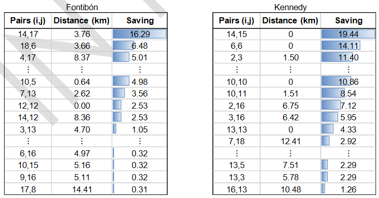 Figure 5 describes what was mentioned above in step two, shows the two district areas (Fontibón and Kennedy) of greater student concentration the company has to cover picking-up and dropping-off, and the values of the savings by pairs of some points. It is worth noting that for each of these areas there were 324 pairs as a result of the combinations after having 18 points or nodes to be traveled by zone.