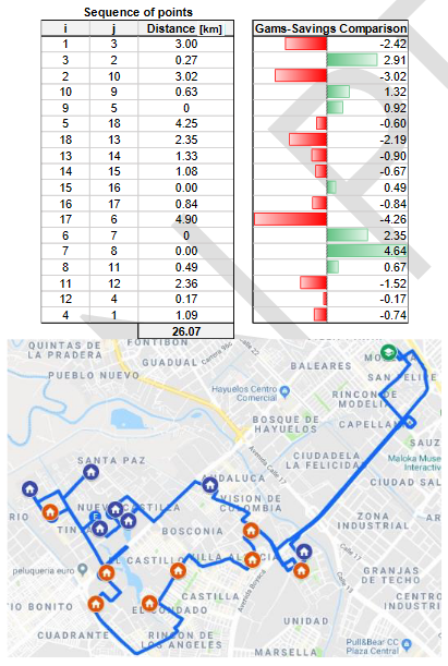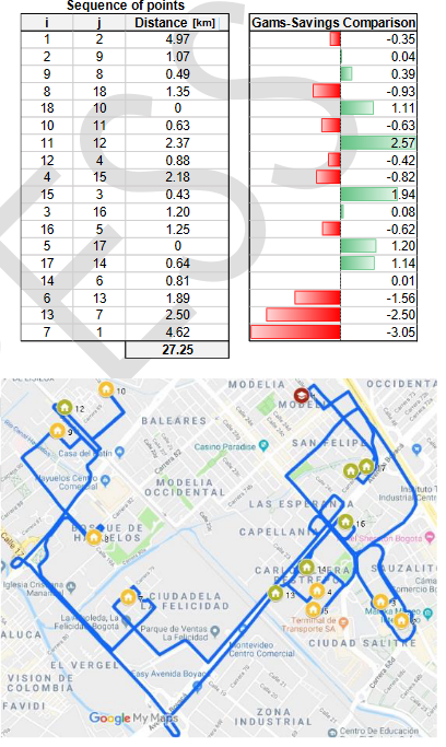When developing the savings algorithm for the Fontibón and Kennedy district areas through an interface programmed in Visual Basic for Applications (VBA), the most appropriate routes for the company were established in such a way that the distance traveled was minimized, taking into account restrictive aspects such as crossroads, that due to high traffic should not be followed. In addition, these results were compared with an optimization technique based on pure binary programming such as the TSP (Traveling Salesman Problem) model, which was developed in the software GAMS 23. These results are observed in Figure 6 for the Kennedy area, where the route on the map is highlighted, the orange points or nodes are those established as the one-way sequence from the school (green dot), and those in blue represent the path back to school.