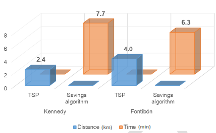 These differences may have resulted due to the fact that in the Savings Model other sequence options were chosen between points. This was done because restrictions of high traffic routes were taken into account since travels occur at peak traffic times in the city. Consequently, although this model does not generate the shortest distance, it does show a shorter transfer time. This can be seen in Figure 8 where there is a shorter transfer time for both routes evaluated, although the distance is greater.