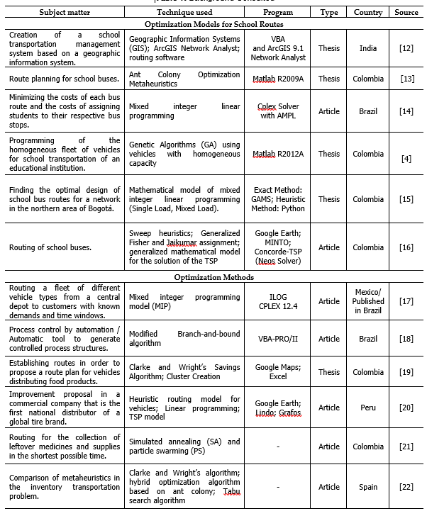 Table 1 shows the information consulted in different articles and undergraduate and master thesis about the vehicle routing problem under different solution methods.