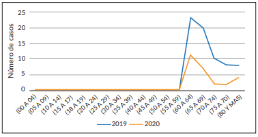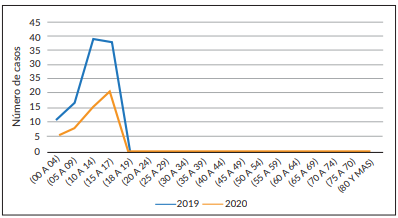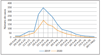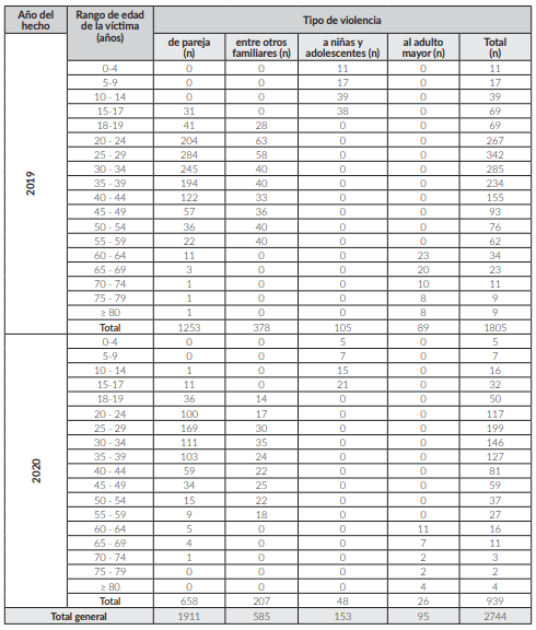 En la tabla anterior se observa que en el año 2020 hubo un descenso considerable de los casos reportados; más aún, se mantiene la variable “Violencia de pareja” en las edades de 20 a 25 años como la que más aporta al peso estadístico.