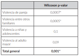 Las comparaciones estadísticas, realizadas mediante la prueba de Wilcoxon para muestras repetidas (Tabla 3), evidencian que existe una diferencia estadística significativa, lo cual muestra que las variaciones de casos según los tipos de violencia difieren entre 2019 y 2020, con excepción de violencia en niñas, adolescentes y adultos mayores (el asterisco en el valor indica diferencia entre las muestras evaluadas).