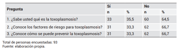 Resultados: se encontró que el 64,5 % de las embarazadas desconocía qué es la toxoplasmosis, y el 66,6 % desconocía los factores de riesgo y los métodos de prevención.