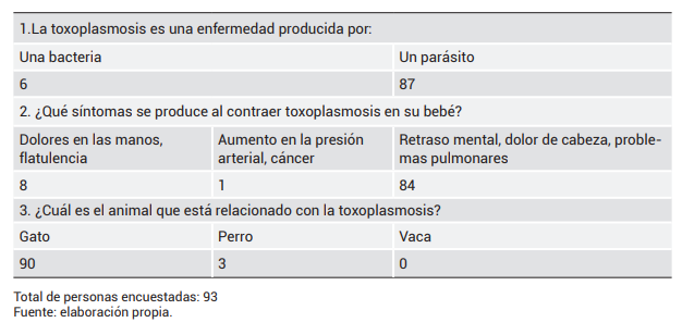 Sin embargo, posterior a la sección informativa acerca de la toxoplasmosis, se obtuvieron mejoras considerables en los resultados. El 96,7 % de las encuestadas mostraron tener conocimiento acerca del agente etiológico, y el 90,3 % conocía los síntomas relacionados con la toxoplasmosis congénita y el principal factor de riesgo.