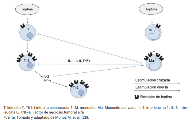 La Figura 1 representa el mecanismo de acción de la leptina al estimular los monocitos para que, a su vez, expresen una mayor cantidad de receptores para la leptina y se activen posteriormente. Esto conduce a la liberación de citoquinas proinflamatorias y la activación subsiguiente de linfocitos T, estableciendo un estado proinflamatorio. Estos linfocitos secretarán interleucina 2 (IL-2) e interferón γ (IFN-γ), que forman parte de la respuesta mediada por los Th1. Esta respuesta es inmunoprotectora y, al mismo tiempo, proinflamatoria; por lo tanto, la leptina se considera una molécula proinflamatoria (28).