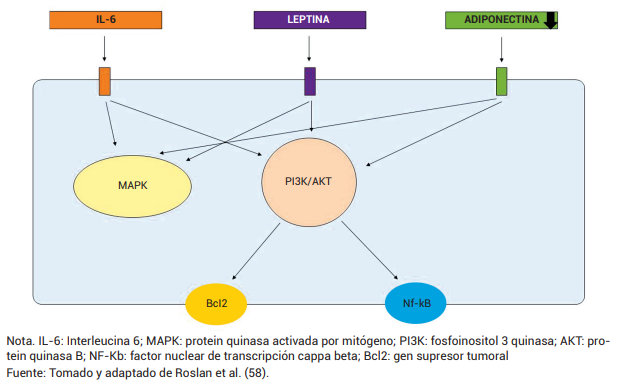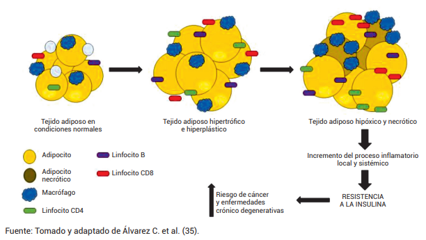En personas obesas, el tejido adiposo está infiltrado por macrófagos y linfocitos CD8+; al tener los adipocitos un cambio morfológico, estas células se activan y pasan a un estado de inflamación con producción de citoquinas proinflamatorias. Además del estado inflamatorio crónico de bajo grado, el cual disminuye la producción de componentes antiinflamatorios, como es el caso de la adiponectina, estimula vías moleculares que culminan en proliferación celular descontrolada y la aparición de neoplasias (22-24).
