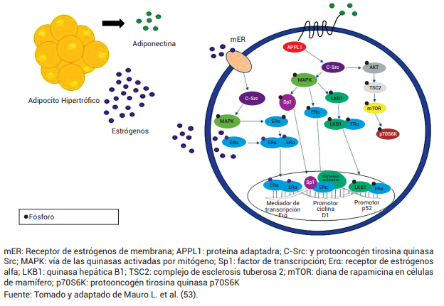 Con el concepto de “diabesidad”, que no es más que la obesidad concomitante con resistencia a la insulina, hiperinsulinemia o hiperglicemia, se ve hiperactivada la vía Insulina/IGF-1, lo que también contribuye a la progresión del cáncer de mama (50). Por otro lado, la leptina también estimula las vías JAK2/STAT3, MAPK y PI3K/AKT, que también están directamente relacionadas con el control celular, la diferenciación, la proliferación, la supervivencia, la migración y la invasión (51). La adiponectina estimula el crecimiento y la proliferación en el cáncer de mama con Receptor de Estrógeno (ER) positivo de la siguiente manera: la interacción entre la molécula de adiponectina y su receptor AdipoR1/APPL1 y el receptor de factor de crecimiento similar a la insulina tipo 1 (IGF-1R) IGF-1R/mER y la proteína tirosina quinasa Src (C-Src), lo que desencadena la activación de MAPK con el fin de mantener y preservar el crecimiento celular. La adiponectina también tiene la capacidad de aumentar la actividad transcripcional de ERα y permite que mTOR active la proteína tirosina quinasa p70S6K (52). Este proceso está mediado además por la disminución de la adiponectina y el aumento de la leptina (Figura 3)