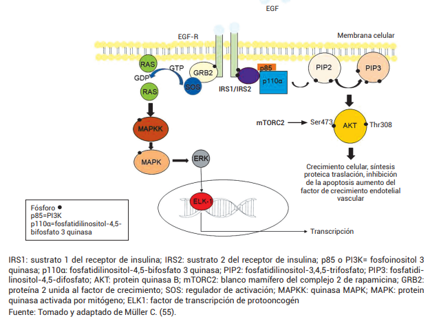 Aquellos pacientes con SM caracterizado por resistencia a la insulina generan un estado de hiperactividad del IGF1-R para la posterior activación de las rutas mediadas por PI3K, RAS y AKT, lo que culminará en procesos proliferativos celulares y en la activación de genes como el HIF-1α, contribuyendo al proceso angiogénico tumoral.