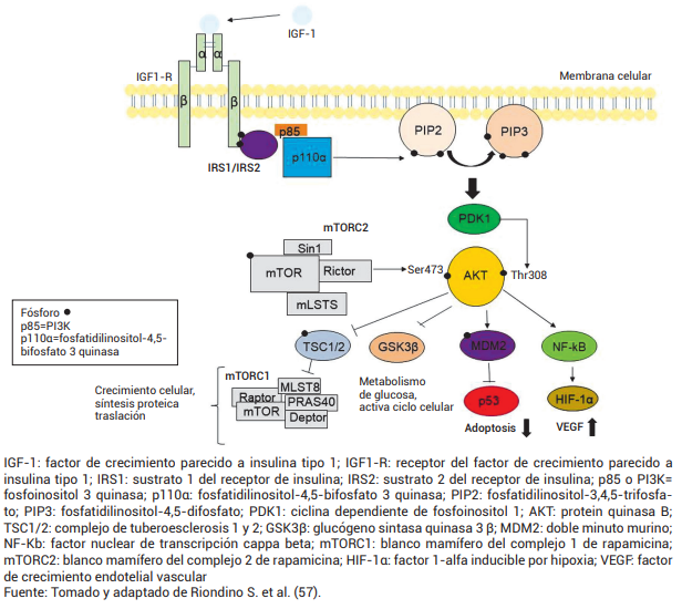 La vía PI3K/AKT puede estar mediada por el IGF-1 y su receptor (IGF1-R). Esta vía se encarga de catalizar la reacción que convierte el fosfatidilinositol-3,4,5-trifosfato (PIP2) en fosfatidilinositol-4,5-difosfato (PIP3). A su vez, PIP3 activará la proteína quinasa 1 (PDK1), que fosforilará la AKT en la posición Thr308 para activarla. La diana de mamífero del complejo de rapamicina 1 (mTORC2) se encarga de fosforilar la AKT en la posición Ser473. La activación de la AKT estimula los procesos cancerígenos, generando bloqueos a nivel de la quinasa del punto de control para aumentar la inestabilidad genómica. Esto incluye un aumento en la actividad del mTORC1, que estimula la síntesis de proteínas y el incremento del ciclo celular. Además, inhibe la glucógeno sintasa quinasa 3β (GSK3β) y estimula el doble minuto murino (MDM2), que actúa como regulador negativo del p53 disminuyéndolo. También se produce un aumento de NF-κB, que activa posteriormente el factor 1-alfa inducible por hipoxia (HIF-1α), lo que aumenta la síntesis del factor de crecimiento endotelial vascular (VEGF). Esto, a su vez, estimula la angiogénesis tumoral (53, 56) (Figura 5).