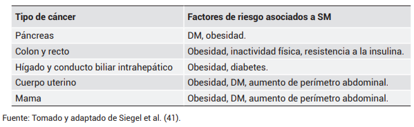 La asociación encontrada entre pacientes con SM y la posterior aparición de neoplasias está mediada principalmente por el sistema inmunológico, seguido de esto, las hormonas producidas a nivel adipocitario son el detonante para la proliferación celular descontrolada y la evasión de las vías apoptóticas. En efecto, los pacientes que cursan con síndrome metabólico se encuentran predispuestos a la aparición de cáncer colorrectal, de páncreas, de hígado, de conducto biliar intrahepático, de cuello uterino y de mama. Adicionalmente, se encontró que los pacientes con fenotipo DM2 tienen tendencia, además de los cánceres mencionados, a desarrollar cáncer de vejiga, endometrial, próstata y linfoma no Hodgkin.