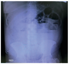 Del centro remisor trae el reporte de hemograma extrainstitucional con evidencia de leve leucocitosis con neutrofilia y parcial de orina no patológico. Ecografía de abdomen total que documenta asas colónicas de paredes engrosadas con discreto edema interesa compatible con colitis. Se realiza una radiografía de abdomen en bipedestación (figura 2), que evidencia la dilatación de asas intestinales delgadas, engrosamiento de pared con presencia de múltiples niveles hidroaéreos y asa centinela en hipocondrio izquierdo.