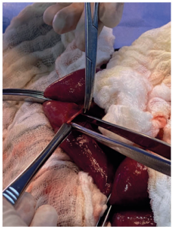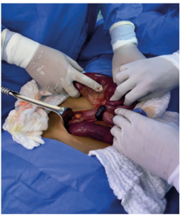 En la intervención quirúrgica se le realizo exéresis de la brida fibrosa, con resección en cuña del divertículo de Meckel y desbridamiento de sus bordes, para posteriormente realizar una enterorafia en dos planos, surget continuo y puntos de refuerzo con Lembert con material de sutura tipo vicryl 3.0 (figura 4). Se realizó una apendicectomía convencional, con manejo de muñón con técnica de Pouchet con seda 2.0 y lavado de la cavidad peritoneal con 3000 cc de solución salina estéril. No se dejaron drenajes. Se secó y aspiró verificando una adecuada hemostasia. Síntesis por planos hasta piel, sin complicaciones inmediatas posquirúrgicas.
