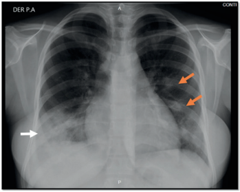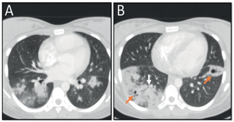 Cabe resaltar que unas de las causas más frecuentes de nódulo pulmonar cavitado agudo y subagudo son las infecciones bacterianas, las cuales pueden alcanzar el parénquima pulmonar mediante la vía inhalatoria, evitando las defensas del huésped; o por medio del torrente sanguíneo, como émbolos sépticos pulmonares (3). En las neumonías necrotizantes y abscesos pulmonares con formación de nódulo cavitado no es típica la neumonía adquirida en la comunidad, pero se han reportado casos de neumonía cavitada, con hallazgos de Streptococcus pneumoniae (4) y Haemophilus influenzae (5); otro microorganismo implicado en la formación de nódulos cavitados en casos de neumonía grave es Klebsiella pneumoniae, principalmente en pacientes inmunosuprimidos (con factores de riesgo tales como alcoholismo y consumo de tabaco), y también en neumonía intrahospitalaria (6), y neumonía adquirida en la comunidad (7). Estos microorganismos fueron considerados como probables etiologías en el presente reporte de caso; ellos pueden originar nódulos cavitados pequeños, que van desde 1 mm hasta 3 cm, con posible progresión a gangrena pulmonar (8), la cual generalmentees causada por Klebsiella pneumoniae, iniciando como una consolidación pulmonar que progresa a pequeños nódulos cavitados y de acuerdo a la evolución, puede desarrollar una gran cavidad pulmonar (9). Otra causa infecciosa de nódulo cavitado es Staphylococcus aureus, casi siempre asociada a neumonía grave, como ocurrió en el paciente del caso actual; en este contexto, sendos estudios realizados en 1996 (10) y en 2005 (11), evidenciaron cavitaciones en radiografías de tórax causadas por este microorganismo, en casos de neumonía adquirida en la comunidad y neumonía intrahospitalaria; las neumonías graves también las pueden provocar embolismos sépticos pulmonares, que dan como resultado nódulos cavitados periféricos, detectables en radiografías (20-47 %) y en tomografía axial computarizada de pulmón (85 %) (11,12).