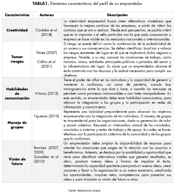 Es importante tener en cuenta que el perfil emprendedor se refiere a las características y habilidades que posee una persona que busca iniciar un negocio o proyecto. Estas habilidades y características incluyen la capacidad de identificar oportunidades de negocio, tener una mentalidad innovadora y creativa, ser capaz de asumir riesgos y aceptar la incertidumbre, tener habilidades de liderazgo y trabajo en equipo, ser perseverante y estar dispuesto a aprender y adaptarse a cambios constantes en el entorno empresarial (Villasmil et al., 2018). Además, este perfil también incluye la capacidad para desarrollar una visión clara y estratégica, establecer objetivos y metas claras, y tener una fuerte orientación hacia el logro de resultados y el éxito en el negocio. También es importante tener habilidades financieras y de gestión empresarial para administrar adecuadamente los recursos y tomar decisiones estratégicas, como lo destacan diversos autores respecto a la relevancia de dicho perfil para el alcance de las metas emprendedoras (Cárdenas y Adié, 2021; Pitre et al., 2020; Villasmil et al., 2018).
